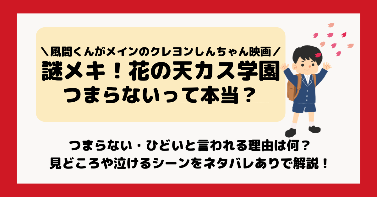 そこで今回は、実際に映画クレヨンしんちゃん「謎メキ!花の天カス学園」は本当につまらないのか、実際に見た感想をネタバレありでレビューします。