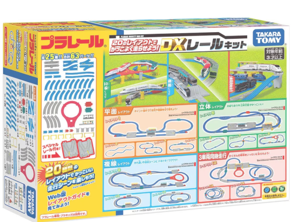 「20のレイアウトでかっこよく走らせよう!DXレールキット」は、直線や曲線など基本レールはもちろん、Uターンレールなど少し複雑なレイアウトにもチャレンジできるセットです。