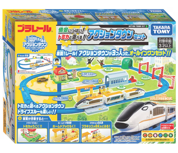 「情景いっぱい!トミカと遊べる!アクションタウンセット」は、車両とレールとアクションタウンが全部入ったセットです。