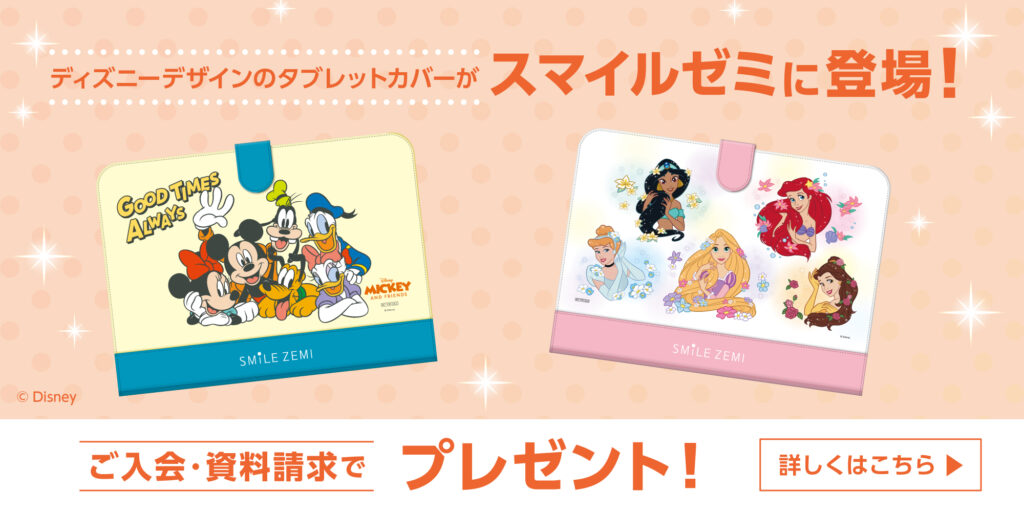 現在スマイルゼミでは、期間限定でディズニーデザインのタブレットカバーがもらえるキャンペーンを実施中!